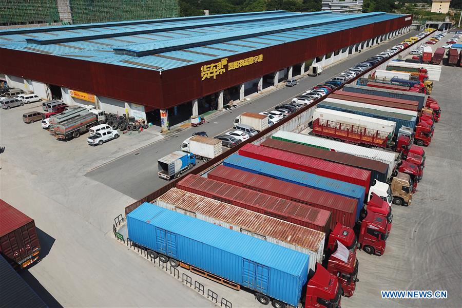Aerial photo taken on Aug. 1, 2018 shows the parking lot of Truck Alliance, China's Uber-type service for trucks, in Guiyang, capital of southwest China's Guizhou Province. Guizhou has become a pioneer in China's big data development. Big data is being widely applied in government management, business and daily life, contributing over 20 percent to the economic growth of Guizhou Province. The number of big data-related companies in Guizhou Province has grown from less than 1,000 in 2013 to more than 8,500 in 2018.(Xinhua/Liu Xu)