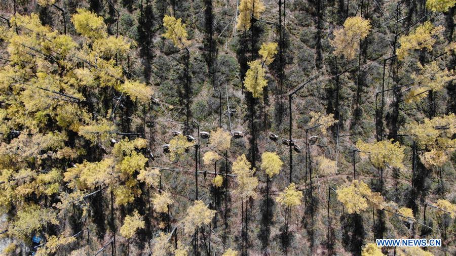Photo taken on Sept. 18, 2018 shows a herd of reindeer roaming in Yue'anli Forest Farm of Genhe forestry bureau in the Greater Khingan Mountains of north China's Inner Mongolia Autonomous Region. Staff members at Yue'anli Forest Farm are responsible for the conservation and breeding work of reindeer in China. (Xinhua/Yu Yang)