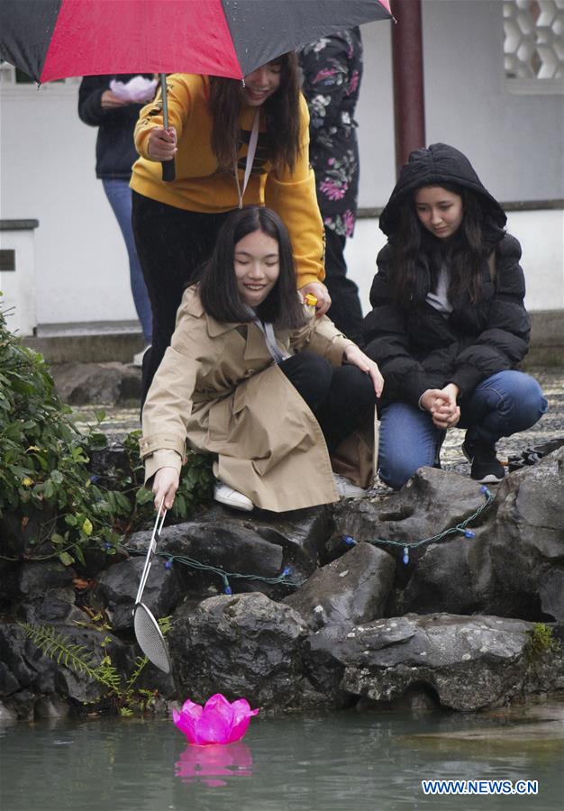 People float a lit lantern on the pond while attending the Mid-Autumn Festival event in Vancouver, Canada, on Sept. 21, 2018. Vancouver Chinatown's Dr. Sun Yat-Sen Classical Chinese Garden hosted a Mid-Autumn Festival celebration to share the Chinese tradition and joy with the community. (Xinhua/Liang Sen)