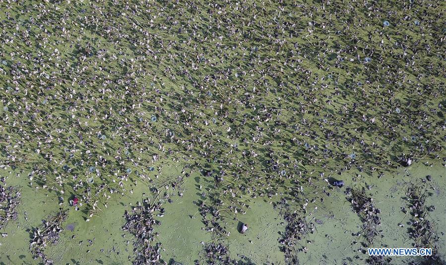 In this aerial photo taken on Sept. 18, 2018, workers dig lotus roots in Wudang Village of Jiangxia District in Wuhan, central China's Hubei Province. In Hubei Province, this year's autumn harvest of lotus roots is underway. Stooping down in waist-deep ponds with feet submerged in mud, each worker holds a high-pressure water gun in one hand and grope for ripe lotus roots with another. The lotus root is one of the most widely used aquatic vegetables in Chinese cooking. The total cultivation area of lotus roots in China is estimated between 3,300 and 4,000 square kilometers, making the country the largest lotus root producer in the world. In recent years, agricultural researchers in Hubei Province have cultivated and promoted new varieties of lotus roots to offer alternatives to producers and customers. (Xinhua/Yin Gang)