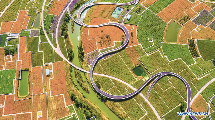 Aerial photo taken on Sept. 25, 2018 shows the flower fields at Santaishan Forest Park in Suqian City, east China's Jiangsu Province. (Xinhua/Zhang Lianhua)