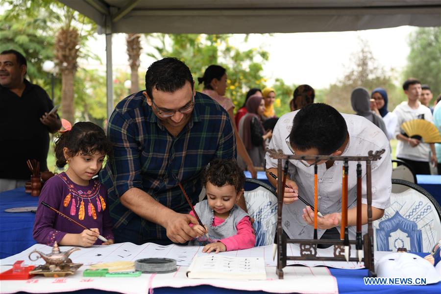 Egyptians learn Chinese calligraphy at Suez Canal University in Ismailia, Egypt, on Oct. 23, 2018. The second edition of the Chinese Culture Day held by the Confucius Institute in Suez Canal University impressed the Egyptian students who gathered with eyes of admiration. (Xinhua/Wu Huiwo)