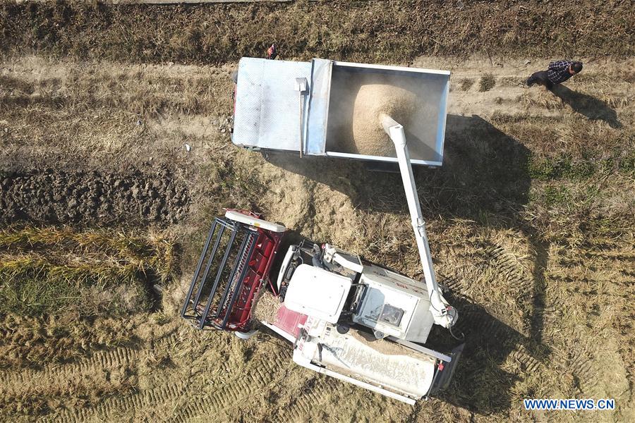 Aerial photo taken on Oct. 29, 2018 shows a farmer harvesting rice in Sanhe Township of the Hongze District in Huai'an, east China's Jiangsu Province. (Xinhua/Wan Zhen)
