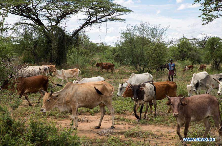 A Karo villager grazes cattle outside of his village near the Omo River in Southern Regional State, Ethiopia, Oct. 27, 2018. Karo people were famous for their artistic ornamental body painting. According to the local residents, male Karo villagers paint all of their bodies while the female only paint their faces with the natural materials grounded by stones nearby. (Xinhua/Lyu Shuai)