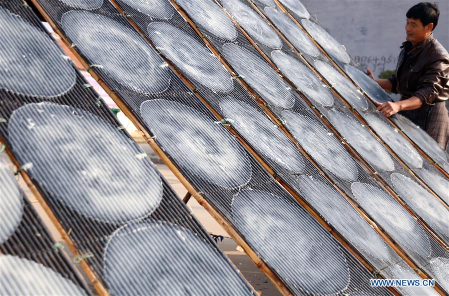 A farmer airs sweet potato starch jelly in Dongzheng Village, Boxing County, east China's Shandong Province, Nov. 13, 2018. (Xinhua/Chen Bin)