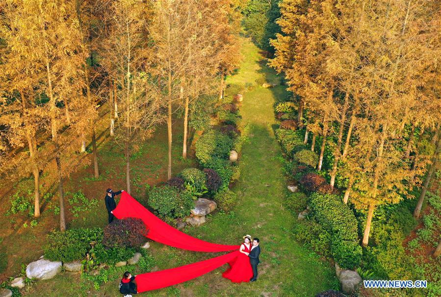 People pose for wedding photo at Nanhu Park in Hengyang, central China's Hunan Province, Nov. 24, 2018. (Xinhua/Cao Zhengping)