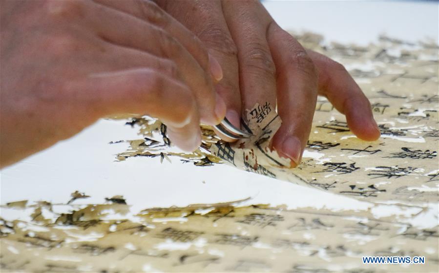 A "doctor" for ancient books uses a nipper to unfold damaged pages at a fixing center for ancient books in Chengdu, capital of southwest China's Sichuan Province, Nov. 29, 2018. More than ten "doctors" work in the center, to revive ancient cultural heritages through continuous efforts, patience and circumspection. (Xinhua/Tang Wenhao)