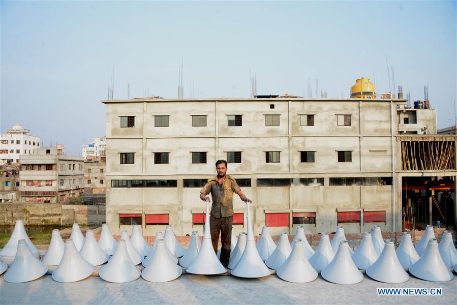 Freshly painted mikes are kept in the sun for drying in Dhaka, capital of Bangladesh, on Dec. 2, 2018. Workers have been putting in overtime to make mikes ahead of the general elections slated for Dec. 30. (Xinhua)