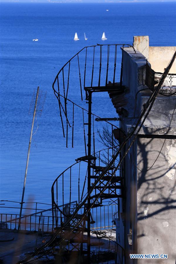 Photo taken on Dec. 8, 2018 shows some damaged properties due to the wildfire in Mati, Greece. It's been almost five months since Greece's deadliest wildfire in many decades ravaged the seaside resort of Mati, but the survivors are still facing many obstacles as they are trying to rebuild their homes and lives. Despite the pain and lost, residents here gathered on Sunday to join the lighting of Christmas tree ahead of the holiday season, sending a strong message of hope and determination to move forward. This summer, 99 people lost their lives when a wildfire swept through the coastal Mati, a city 30 km east of Athens. (Xinhua/Marios Lolos)