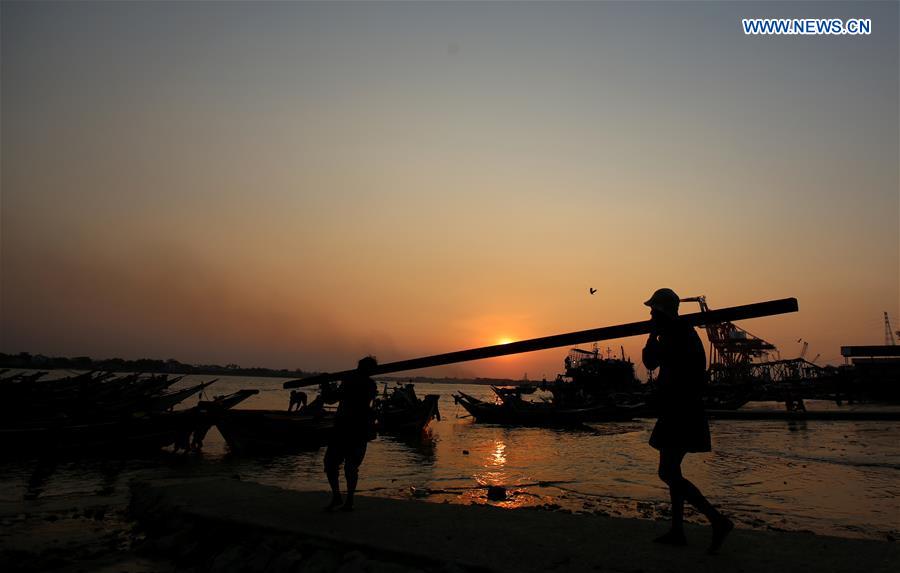 Laborers work at a bank of Yangon river in Yangon, Myanmar, Dec. 28, 2018. (Xinhua/U Aung)