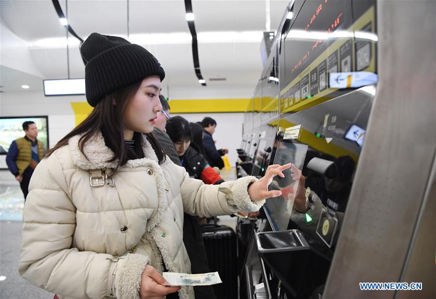 A passenger buys a ticket on a machine at Shapingba station in southwest China's Chongqing, Dec. 28, 2018. North-east part of Chongqing rail transit loop line started trial operation on Friday. (Xinhua/Wang Quanchao)
