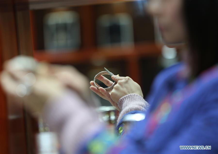 A woman polishes silverware at a workshop in Wulingyuan District of Zhangjiajie, central China's Hunan Province, Jan. 13, 2019. As the Spring Festival is approaching, more traditional silverwares are in demand. The local workshops have been expanding production and promoting sales through live streaming and online platforms. (Xinhua/Wu Yongbing)