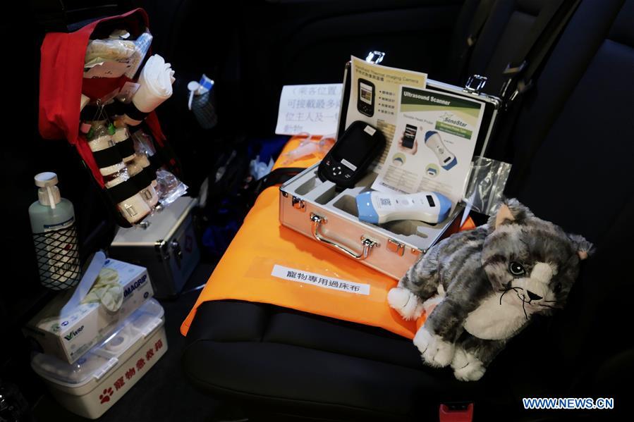 First aid equipment in a pet ambulance is seen on a pet show at the Hong Kong Convention and Exhibition Center in south China's Hong Kong, Jan. 18, 2019. The two-day exhibition for pets and pet goods kicked off here on Friday. (Xinhua/Wang Shen)