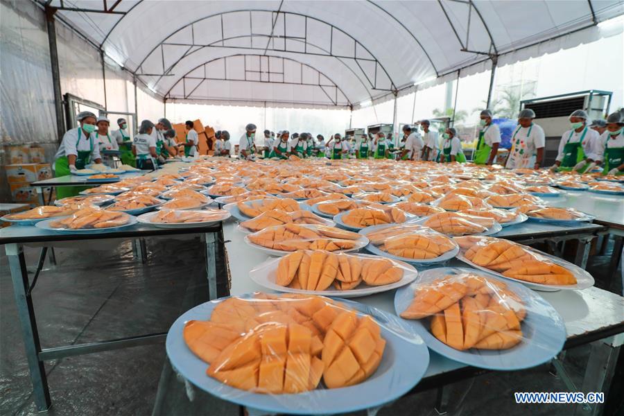 Chefs make the mango sticky rice in Bangkok, Thailand, Jan. 20, 2019. The rice was made of 1,500-kg sticky rice, 2,300-kg coconut juice and 5,000 mangoes. The total weight of the mango sticky rice reached 4,500 kilograms. The event aims to set a Guinness World Record for the largest serving of mango sticky rice. (Xinhua/Zhang Keren)