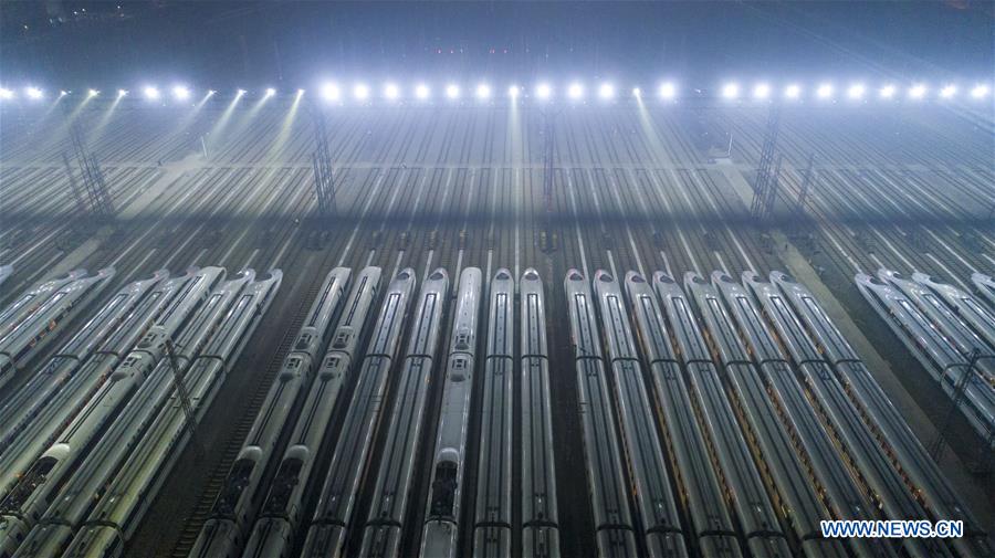 Aerial photo taken on Jan. 20, 2019 shows high speed trains to be maintained in Wuhan, capital of central China's Hubei Province. Some 100 high speed trains were maintained here for the 2019 Spring Festival travel rush, known as Chunyun, which started Monday. The Spring Festival, or Chinese Lunar New Year, falls on Feb. 5 this year. (Xinhua/Xiong Qi)