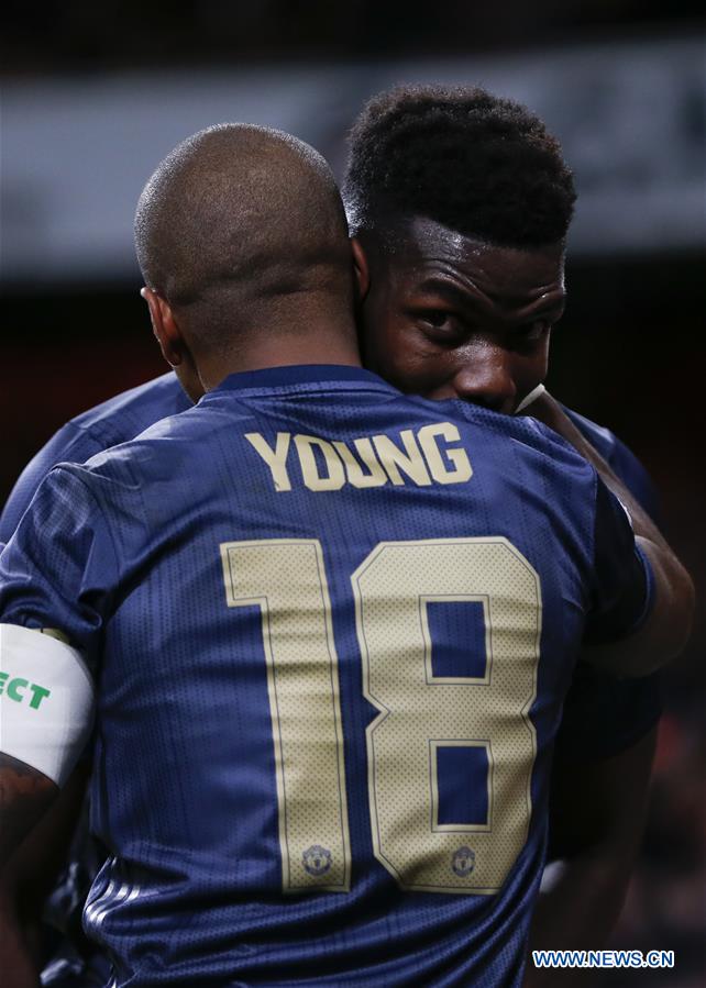 Manchester United's Paul Pogba (R) and Manchester United's Ashley Young celebrate Anthony Martial's goal during the FA Cup fourth round match between Arsenal and Manchester United at the Emirates Stadium in London, Britain on Jan. 25, 2019. Manchester United won 3-1. (Xinhua/Han Yan)