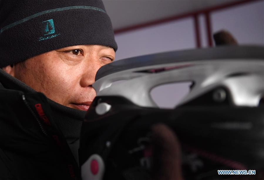 Photo taken on Jan. 9, 2019 shows Li Weiming, the PE teacher, checks the ice blade for the students at Taipingzhuang Central Primary School, in Yanqing District of Beijing, capital of China. Taipingzhuang Central Primary School situated right at the foot of Xiaohaituo Mountains, where the venues for Beijing 2022 Winter Olympic games are under construction. Teachers of Taipingzhuang Central Primary School have turned an experimental farmland into a seasonal skating rink for the pupils here to learn skating since 2016. The school hired a experienced coach, Li Chunyu, to teach the students skating skills. To maintain this outdoor rink, the head teacher of this school, Ding Jianpei, and other teachers have to clean the ice ground after work and use self-made sprinklers to spray water on it every night, so that the ice will be solid and smooth. With these facilities and training courses, almost all of the 143 students in Taipingzhuang Central Primary School have acquired the skill of skating, and some of them even participated in regional competitions and earned prizes. "Our faculties want to help the students get these skills, not necessarily means they will be professional athletes when they grow up, we just want to help them feel the joy of skating." said Ding Jianpei, the head teacher. (Xinhua/Zhang Chenlin)