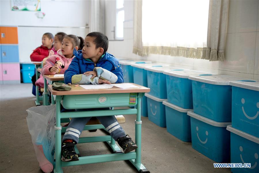 Photo taken on Jan. 10, 2019 shows Shan Ziyuan (front) looks on during a class in Taipingzhuang Central Primary School, in Yanqing District of Beijing, capital of China. The helmet and protectives pads for skating are placed in the blue plastic cases in their class room. Taipingzhuang Central Primary School situated right at the foot of Xiaohaituo Mountains, where the venues for Beijing 2022 Winter Olympic games are under construction. Teachers of Taipingzhuang Central Primary School have turned an experimental farmland into a seasonal skating rink for the pupils here to learn skating since 2016. The school hired a experienced coach, Li Chunyu, to teach the students skating skills. To maintain this outdoor rink, the head teacher of this school, Ding Jianpei, and other teachers have to clean the ice ground after work and use self-made sprinklers to spray water on it every night, so that the ice will be solid and smooth. With these facilities and training courses, almost all of the 143 students in Taipingzhuang Central Primary School have acquired the skill of skating, and some of them even participated in regional competitions and earned prizes. "Our faculties want to help the students get these skills, not necessarily means they will be professional athletes when they grow up, we just want to help them feel the joy of skating." said Ding Jianpei, the head teacher. (Xinhua/Ju Huanzong)