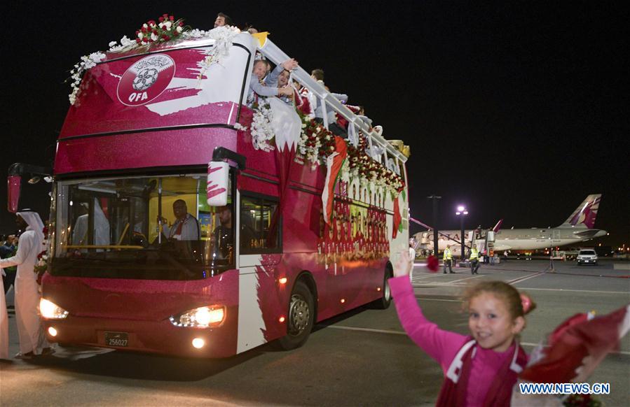 Qatari national soccer team players wave to fans on a bus upon arrival at Doha International Airport in Doha, Qatar on Feb. 2, 2019. Qatar won 3-1 over Japan to claim the title of the AFC Asian Cup for the first time. (Xinhua/Nikku)