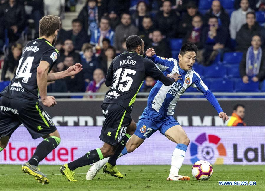 RCD Espanyol's Wu Lei (R) competes with Huesca's Carlos Akapo (C) during a Spanish league match in Barcelona, Spain, Feb.22, 2019. (Xinhua/Joan Gosa)