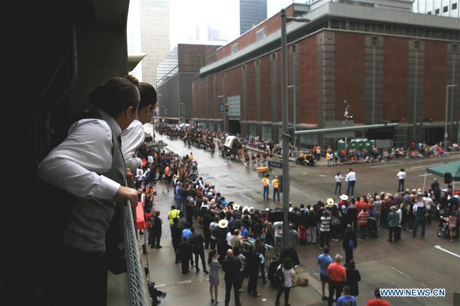 People watch the Houston Livestock Show and Rodeo Parade in Houston, Texas, the United States, Feb. 23, 2019. More than 2,000 trail riders gathered in downtown Houston for a parade on Saturday, celebrating the upcoming Houston Livestock Show and Rodeo which will be held from Feb. 25 through March 17. (Xinhua/Qiu Ma)