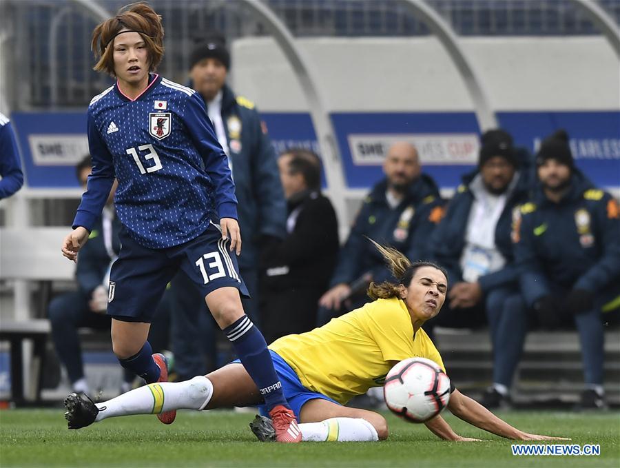 Marta (R) of Brazil vies with Mayu Ikejiri of Japan during a SheBelieves Cup women's soccer match at Nissan Stadium in Nashville, Tennessee, the United States, March 2, 2019. Brazil lost 1-3. (Xinhua)