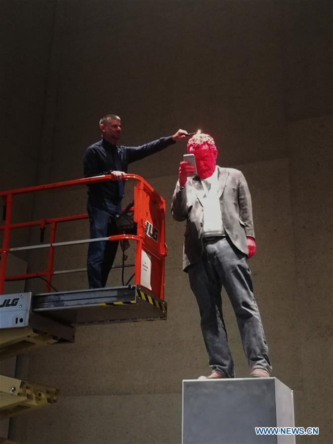 National Gallery Director Nick Mitzevich takes an elevator to light up the wax candle at the National Gallery of Australia in Canberra, Australia, March 15, 2019. The National Gallery of Australia (NGA) unveiled a wax candle sculpture on Friday morning. The sculpture, a man reading on his iPhone, was lit up and will ultimately melt into a puddle. "This sculpture shows us that art in the 21st century shape shifts, it is not static, it is alive and always changing, reflecting the world in which we live," National Gallery Director Nick Mitzevich said. The four-meter sculpture, Francesco 2017, is NGA's latest major acquisition by artist Urs Fischer. It depicted a man standing on a refrigerator, his head lowered to look at the iPhone, as a reminder of the common obsession of people nowadays with electronic devices. (Xinhua/Bai Xu)