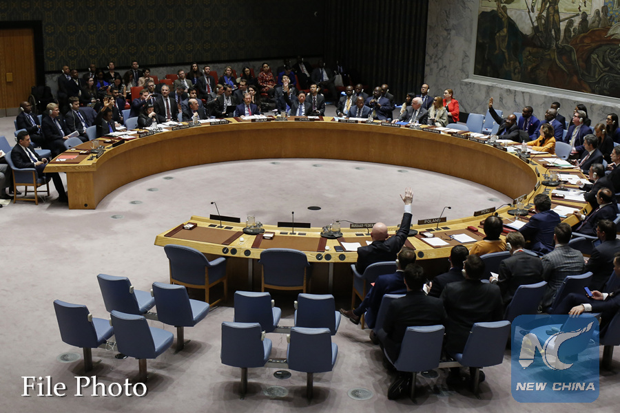 The photo taken on Feb. 28, 2019 shows the United Nations Security Council voting on a Russia-drafted resolution on Venezuela at the UN headquarters in New York. (Xinhua/Li Muzi)