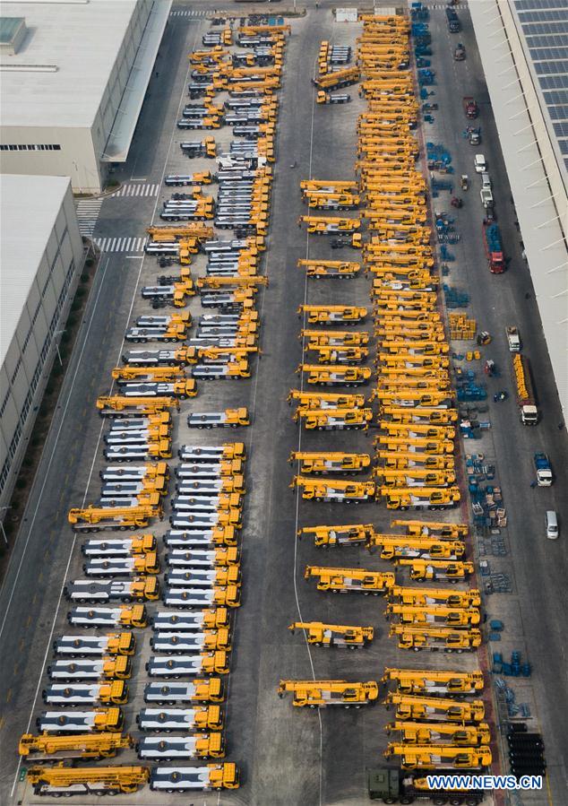 Aerial photo taken on April 4, 2019 shows cranes to be adjusted at the Xuzhou Construction Machinery Group Co., Ltd. in Xuzhou, east China's Jiangsu Province. (Xinhua/Li Xiang)