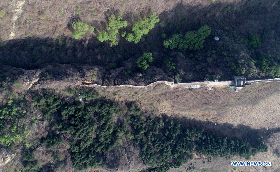 Aerial photo taken on April 19, 2019 shows the Huangyaguan Great Wall in the northern suburb of Tianjin, north China. The Huangyaguan Great Wall was built more than 14 centuries ago for border defense purpose. The structure winds its way for about 3,000 meters along the mountain areas of today's Jizhou District on the outskirts of Tianjin. (Xinhua/Yue Yuewei)