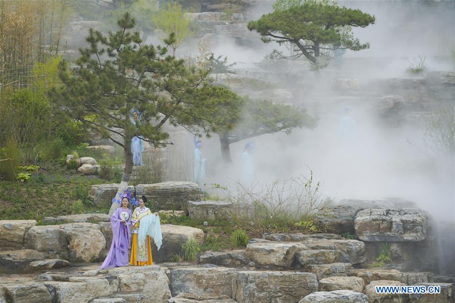 Actresses in costumes perform nearby the Yongning Pavilion of the International Horticultural Exhibition 2019 Beijing in Yanqing District of Beijing, capital of China, April 29, 2019. The expo opened to the public on Monday. (Xinhua/Shen Bohan)
