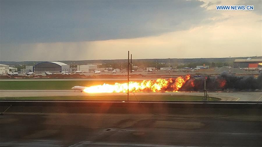 A passenger plane is seen on fire during its emergency landing in Sheremetyevo International Airport in Moscow, Russia, on May 5, 2019. Russia's Investigative Committee confirmed Monday that 41 people were killed after an SSJ-100 passenger plane en route to the northwestern Russian city of Murmansk caught fire before an emergency landing Sunday at the Sheremetyevo International Airport in Moscow. (Xinhua/Sergei)