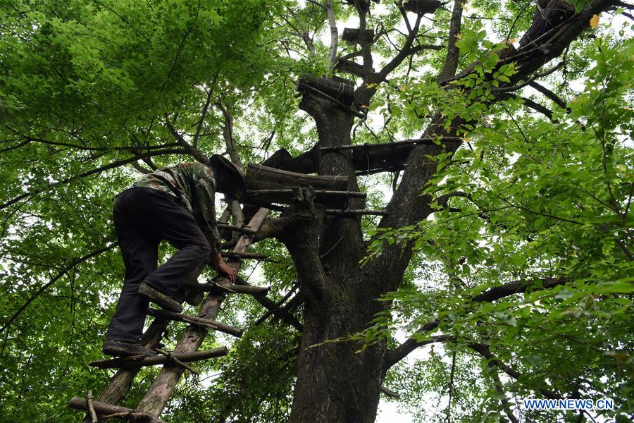 Beekeeper Liu Huilin of a bee cultivation cooperative climbs a tree to inspect a beehive at Yingwan Village of Longnan City, northwest China's Gansu Province, May 10, 2019. Nestled in remote mountainous area, Yingwan village faced the challenge to get rid of poverty. In 2017, villagers started to produce honey through a newly-founded bee cultivation cooperative with support from local government. Beekeepers here, who combine the traditional way of bee-keeping with modern processing method, find a broader market through online platforms. The cooperative is now running over 2,000 beehives, each of which is able to bring 3,000-4,000 yuan (440-586 U.S. dollars) per year. (Xinhua/Ma Ning)