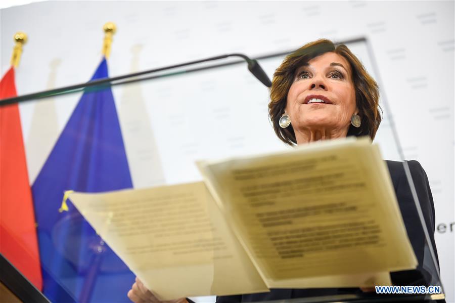 Brigitte Bierlein makes a statement in Vienna, Austria, June 3, 2019. Brigitte Bierlein, the 69-year-old former head of Austria's top court, has officially taken office as the first female chancellor for the country. (Xinhua/Guo Chen)
