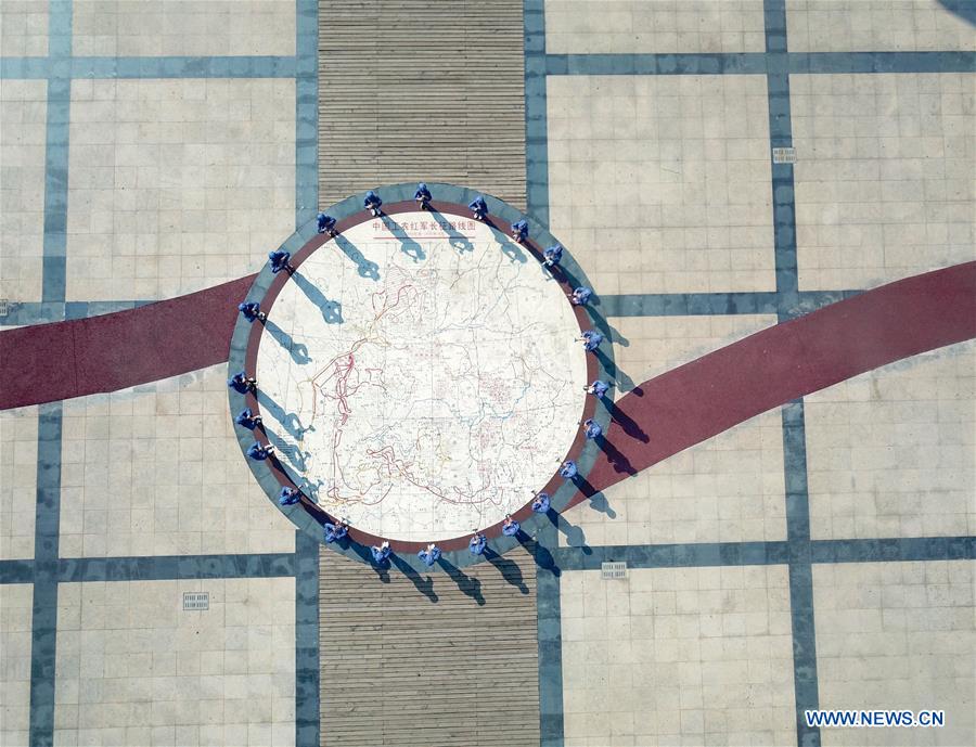 Pupils from Changzhengyuan Primary School perform to pay tribute in front of a monument marking the departure of the Long March by the Central Red Army in Yudu County, east China's Jiangxi Province, Sept. 29, 2018. Yudu is the starting point of the Long March, a military maneuver carried out by the Chinese Workers' and Peasants' Red Army from 1934 to 1936. China has launched an activity that will take journalists to retrace the route of the Long March. The activity is aimed at paying tribute to the revolutionary martyrs and passing on the traditions of revolution, as the country celebrates the 70th anniversary of the founding of the People's Republic of China this year. (Xinhua/Hu Chenhuan)