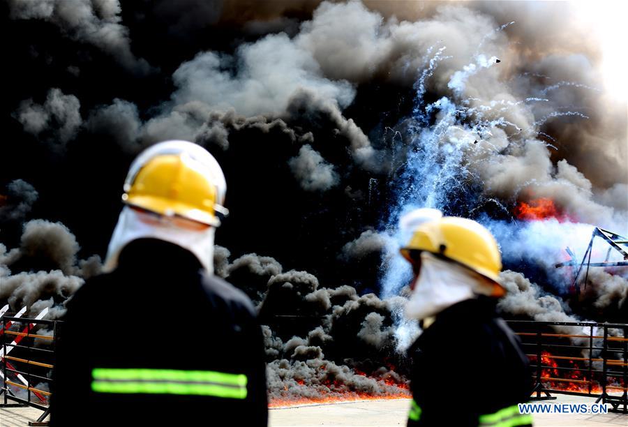 Smokes and flames billow from burning seized drugs during a drug destruction ceremony marking the International Day against Drug Abuse and Illicit Trafficking in Yangon, Myanmar, June 26, 2019. (Xinhua/U Aung)