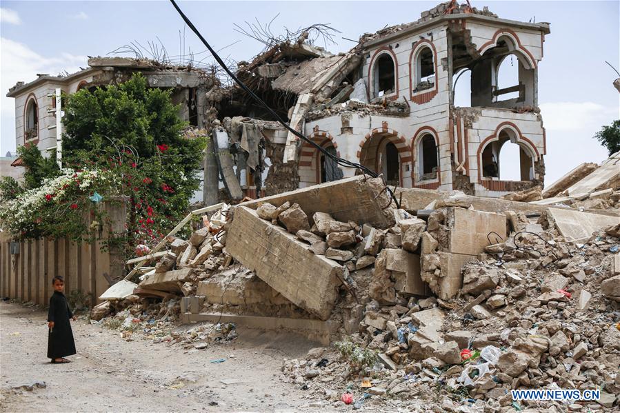 A child walks by a house destroyed during the ongoing war in Sanaa, Yemen, June 29, 2019. (Xinhua/Mohammed Mohammed)