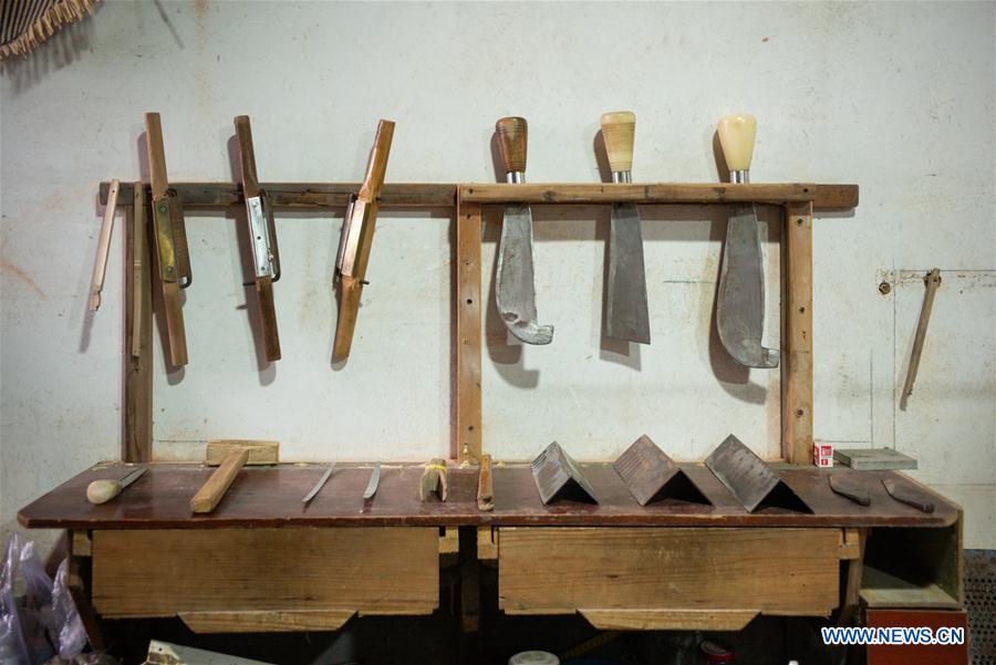 Photo taken on July 4, 2019 shows Ma Jilin's tools in Xinshi Township of Deqing County, east China's Zhejiang Province. Ma Jilin, 74, is an inheritor of Ma's bamboo strip knitting, which has been listed as an intangible culture heritage of Huzhou City in 2019. Ma started to learn the handicraft after his father when he was 10. He started to make a living across China with his father at the age of 15. During the past 60 years, Ma Jilin has been committed to inheriting and promoting Ma's bamboo strip knitting. Furthermore, he improved the techniques to make bamboo strips more smooth and crafts more refined. (Xinhua/Zhang Xiaoyu)