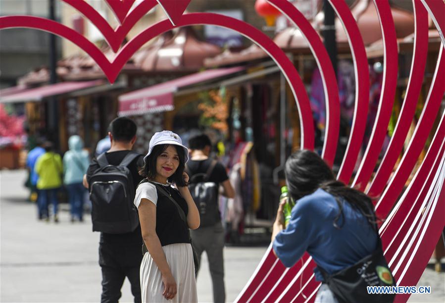 Tourists take photos at the Grand Bazaar in Urumqi, northwest China's Xinjiang Uygur Autonomous Region, July 5, 2019. In recent years, tourism in Xinjiang has been rapidly developing. In 2018, Xinjiang received more than 150 million tourist trips, up 40.09 percent from 2017. In the first five months of 2019, Xinjiang has seen nearly 50 million tourist trips, up 51.4 percent from the same period in 2018. (Xinhua/Zhao Ge)