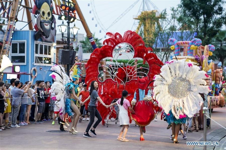 Visitors enjoy themselves at an amusement park at dusk in Chongqing, southwest China, July 6, 2019. (Xinhua/Liu Chan)