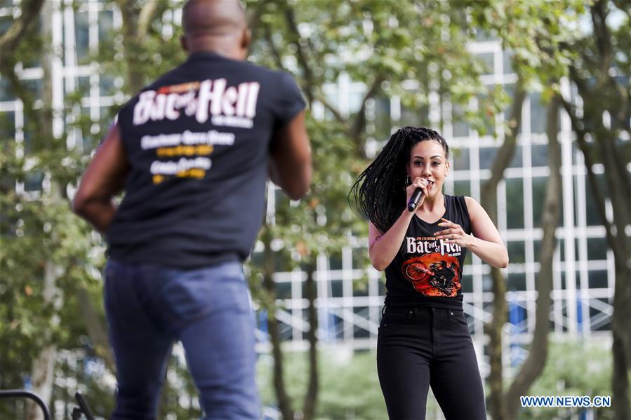 Artists from musical Bat out of Hell perform during the event Broadway in Bryant Park 2019 at Bryant Park in New York, the United States, on July 11, 2019. The Broadway in Bryant Park 2019 is scheduled to be held on six consecutive Thursdays beginning from July 11, during which the popular shows on and off Broadway perform their biggest hits. (Xinhua/Wang Ying)