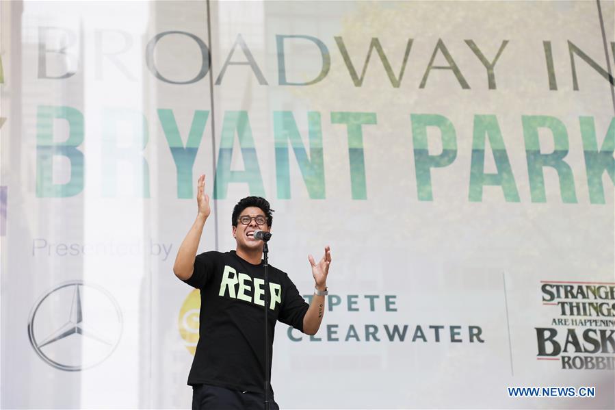George Salazar of musical Be More Chill performs during the event Broadway in Bryant Park 2019 at Bryant Park in New York, the United States, on July 11, 2019. The Broadway in Bryant Park 2019 is scheduled to be held on six consecutive Thursdays beginning from July 11, during which the popular shows on and off Broadway perform their biggest hits. (Xinhua/Wang Ying)