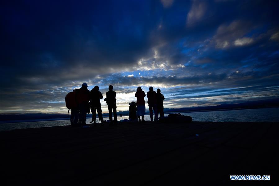 Tourists take photos at the Caka Salt Lake scenic spot at Caka Town of Wulan County, northwest China's Qinghai Province, July 18, 2019. Caka Salt Lake, covering an area of 105 square kilometers and with an altitude of 3,100 meters, attracts many tourists in summer. (Xinhua/Zhang Long)