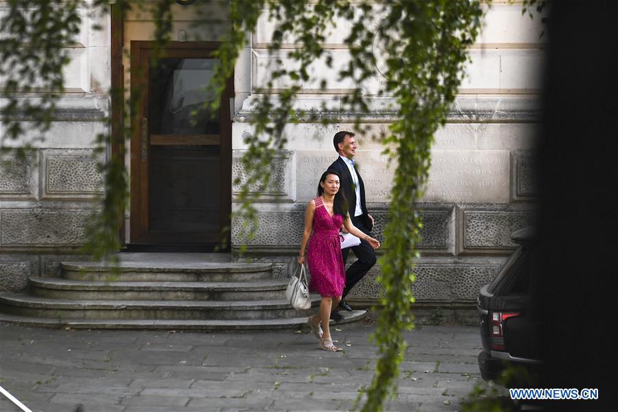 Former British Foreign Secretary Jeremy Hunt (rear) and his wife leave his office, in London, Britain, on July 24, 2019. Britain's new Prime Minister Boris Johnson named the first of his new front bench ministers on Wednesday night. (Photo by Alberto Pezzali/Xinhua)