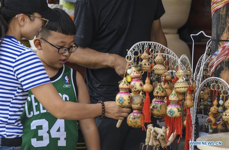 Tourists select handicrafts in the ancient city of Kashgar, northwest China's Xinjiang Uygur Autonomous Region, Aug. 16, 2019. Kashgar has received 4.5 million tourists from January to July this year. (Xinhua/Wang Fei)