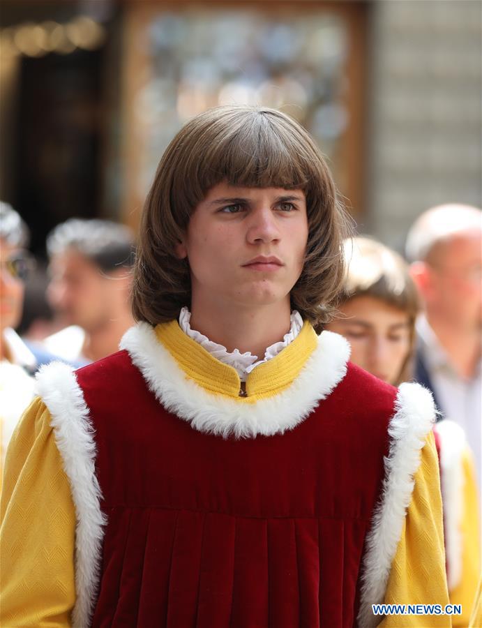 A man dressed in a medieval costume participates in a parade during the Palio in Siena, Italy, on Aug. 16, 2019. The traditional horse race Palio is held every July and August in Italian historical city of Siena. (Xinhua/Cheng Tingting)