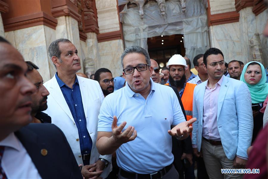 Egyptian Antiquities Minister Khaled al-Anany (C) speaks in the Baron Empain Palace in Cairo, Egypt, on Aug. 18, 2019. Egyptian Antiquities Minister Khaled al-Anany on Sunday denied reports that the original character of the legendary Baron Empain Palace in Cairo's Heliopolis district has been changed during the ongoing restoration work of the 20th century's masterpiece. (Xinhua/Ahmed Gomaa)
