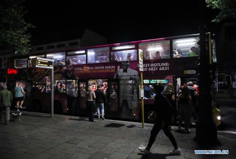 People prepare to get on a bus at the Unter den Linden boulevard in Berlin, capital of Germany, on Aug. 19, 2019. (Xinhua/Shan Yuqi)