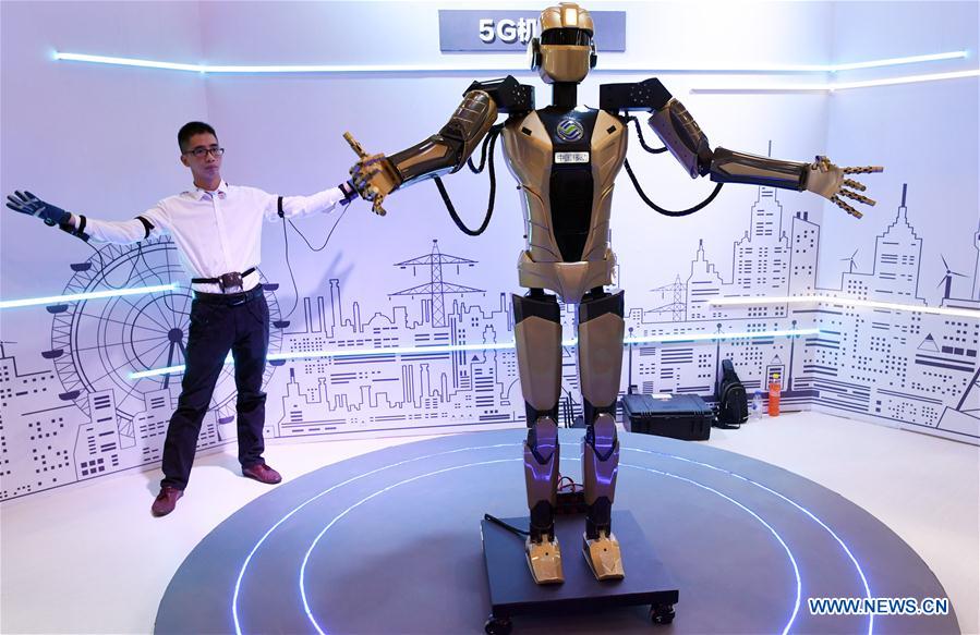 A visitor experiences a 5G synchronous-control-system-supported robot at the 12th China-Northeast Asia Expo in Changchun, northeast China's Jilin Province, Aug. 23, 2019. The five-day expo themed on "enhancing mutual trust and cooperation to create beautiful prospects for Northeast Asia" opened Friday in the city of Changchun. (Xinhua/Lin Hong)