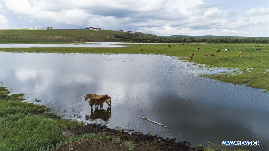 Aerial photo taken on Aug. 26, 2019 shows horses along the Yimin River on the Hulunbuir Grassland, north China's Inner Mongolia Autonomous Region. Located in the northeastern Inner Mongolia Autonomous Region, Hulunbuir, named after the Hulun Nur and Buir Nur, covers an area of about 253,000 square kilometers. It is home to more than 40 ethnic groups, including Han, Mongolian, Daur, Ewenki, Oroqen and Russian, etc. It boasts beautiful grasslands and vast forests, among which more than 500 lakes, over 3,000 rivers and large scale wetlands dot. The grassland, clear water, blue sky, white clouds, cattle and sheep have made Hulunbuir a famous tourist destination. (Xinhua/Shen Bohan)